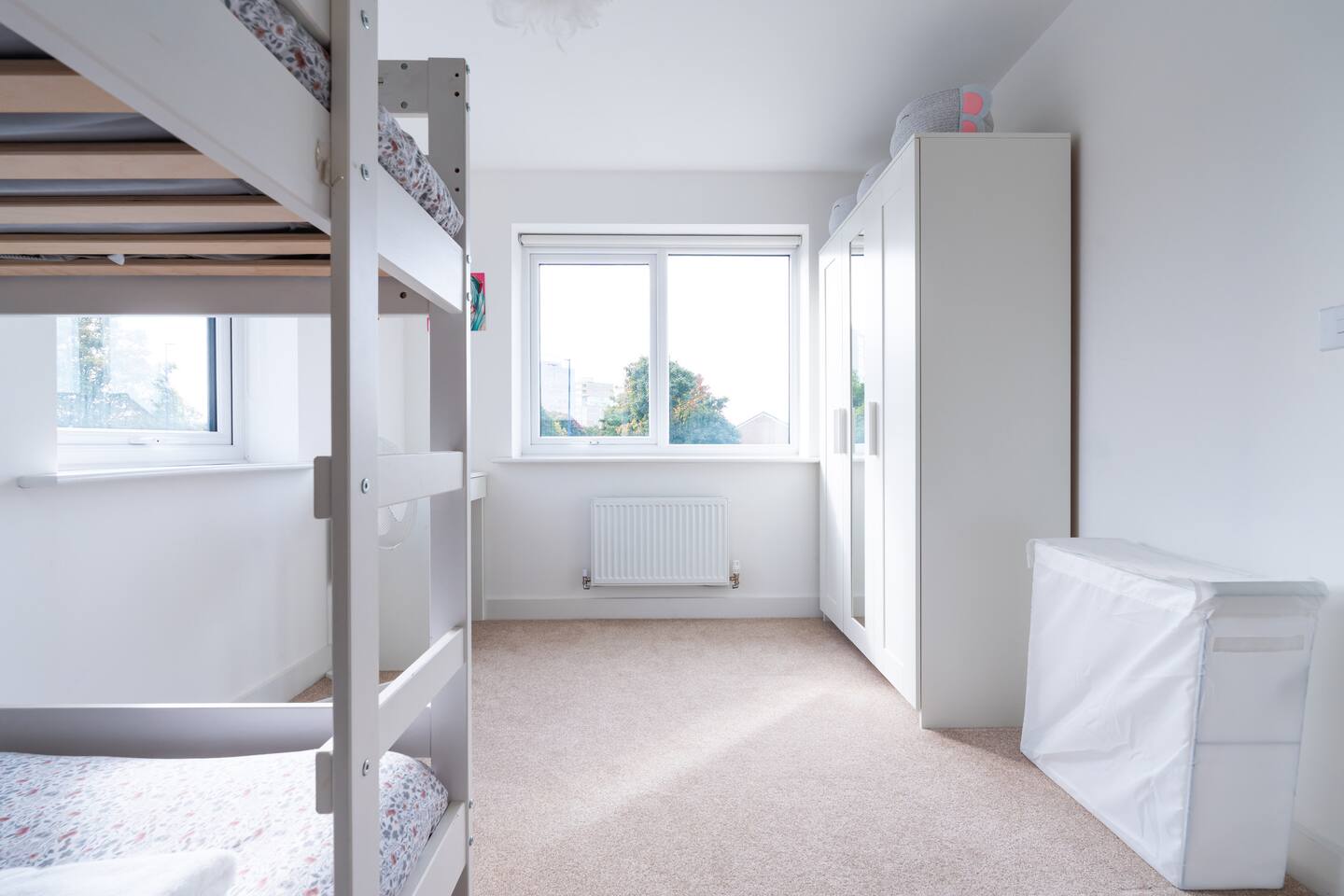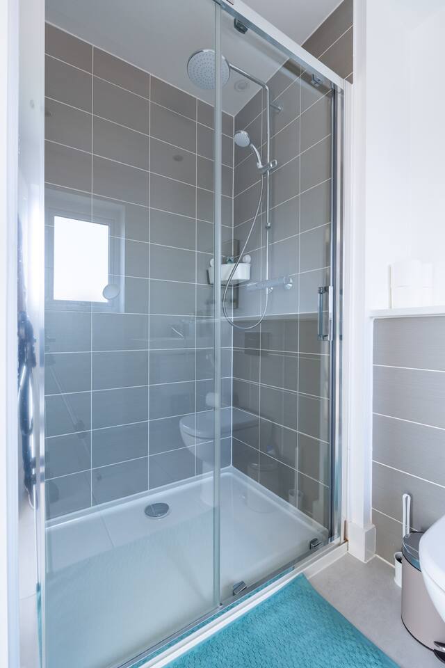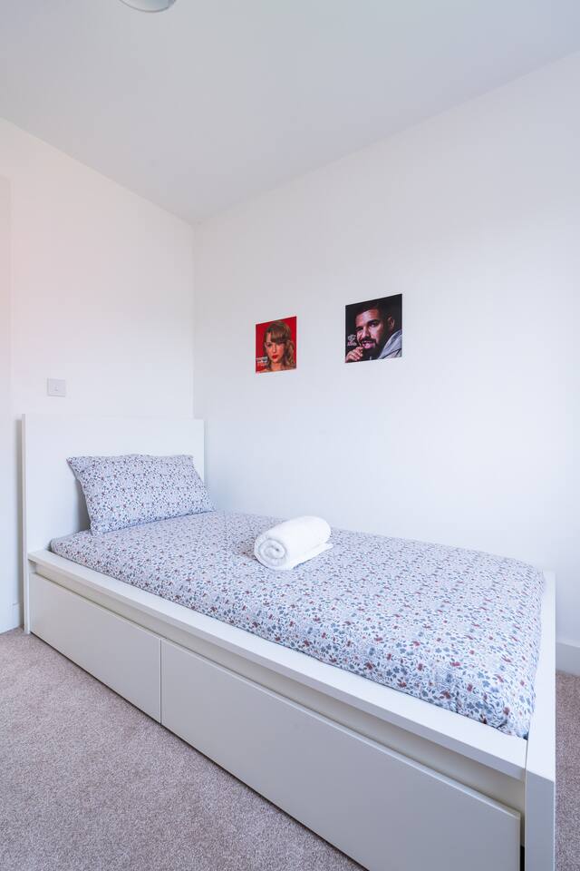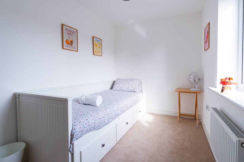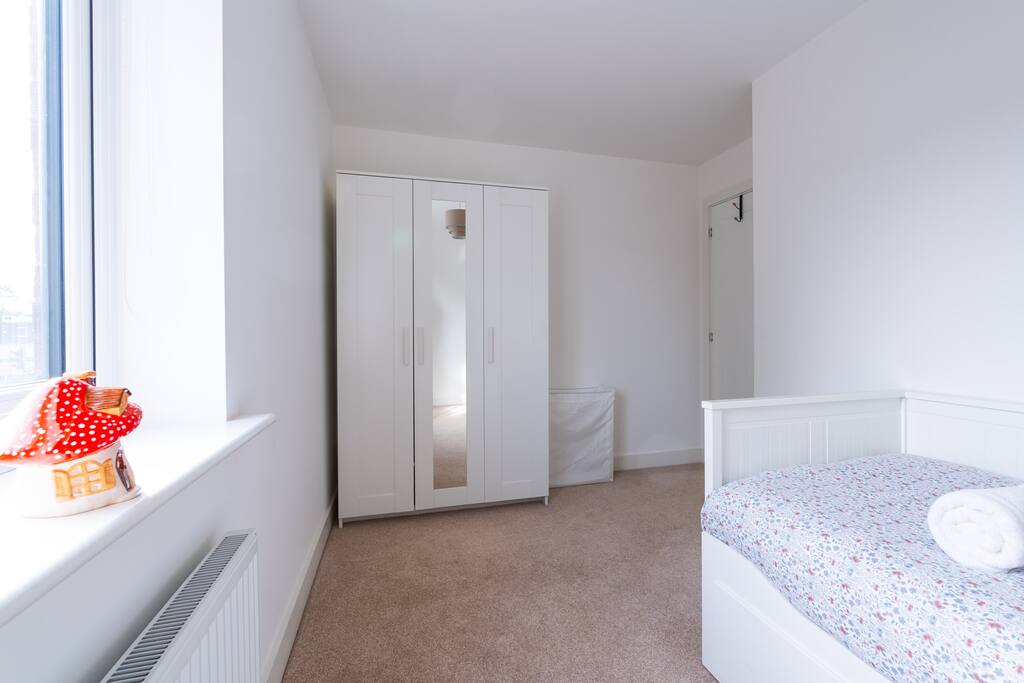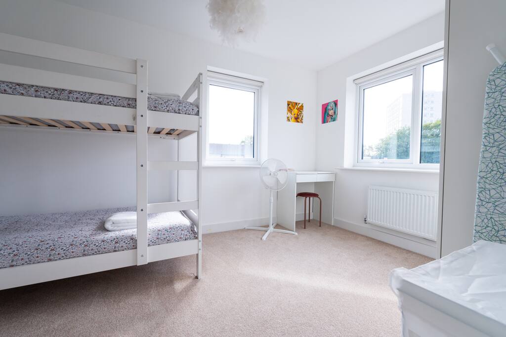 There is a good-sized driveway for 3 cars. Inside the house on the ground floor, you will find a fully equipped kitchen with a dishwasher, oven, fridge freezer, cooking pots, dishes etc, on this floor there is also a living room and access to the garden, and a convenient WC. The first floor consists of 3 bedrooms and a bathroom with a shower and bathtub. The beds are arranged as follows: a) Bedroom: 1 single bed b) Bedroom: 1 single bed that can be pulled to make a double bed c) Bedroom: 1 bunk bed When you land on the second floor, you will find a massive bedroom with a super king bed, a private bathroom, and plenty of space, light, and a view of the city center. Chest of drawers and/or wardrobes can be found in all bedrooms.