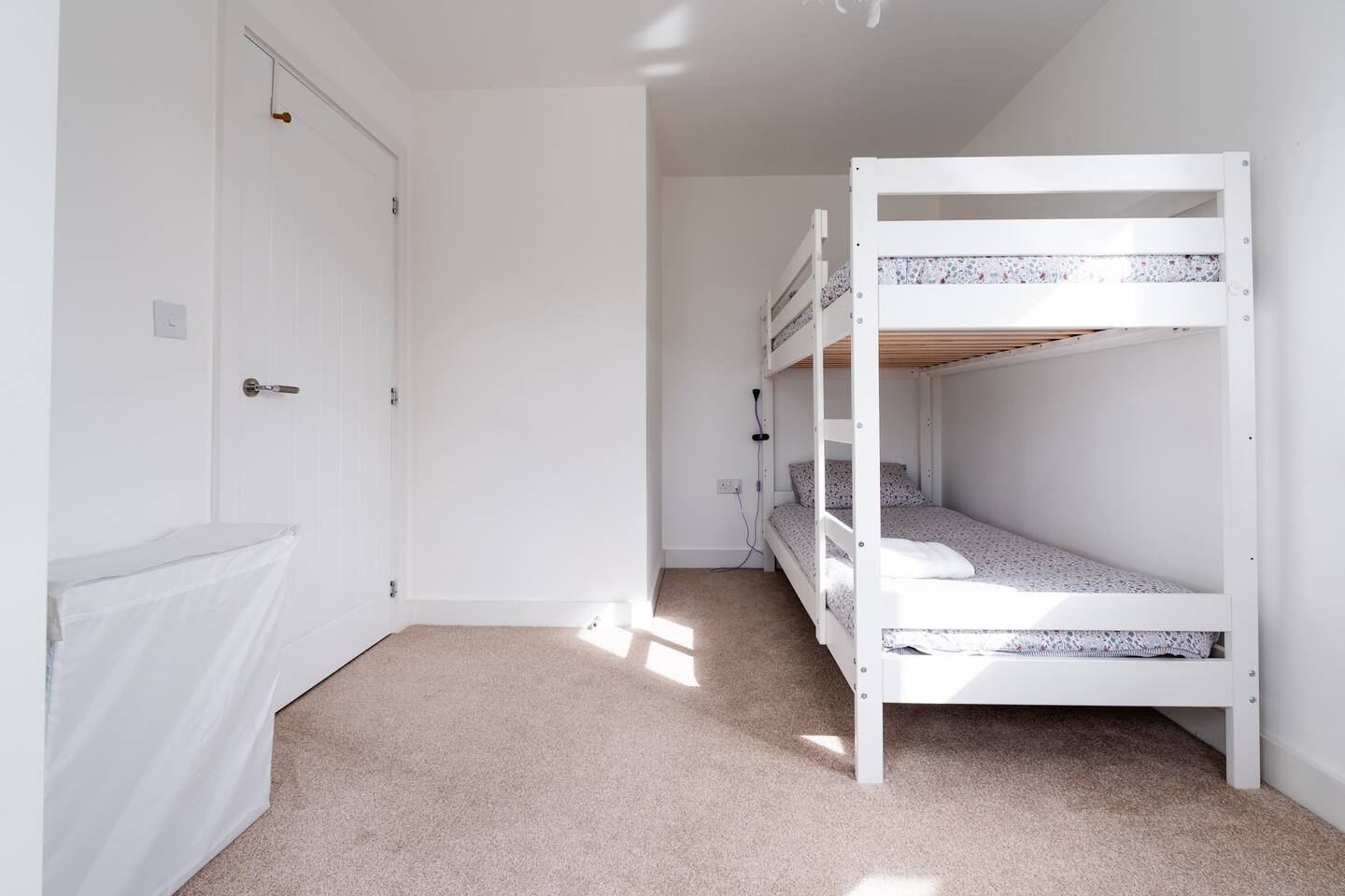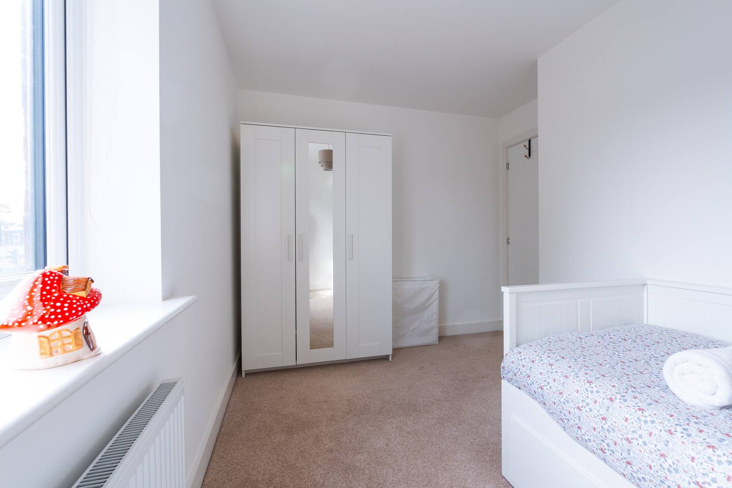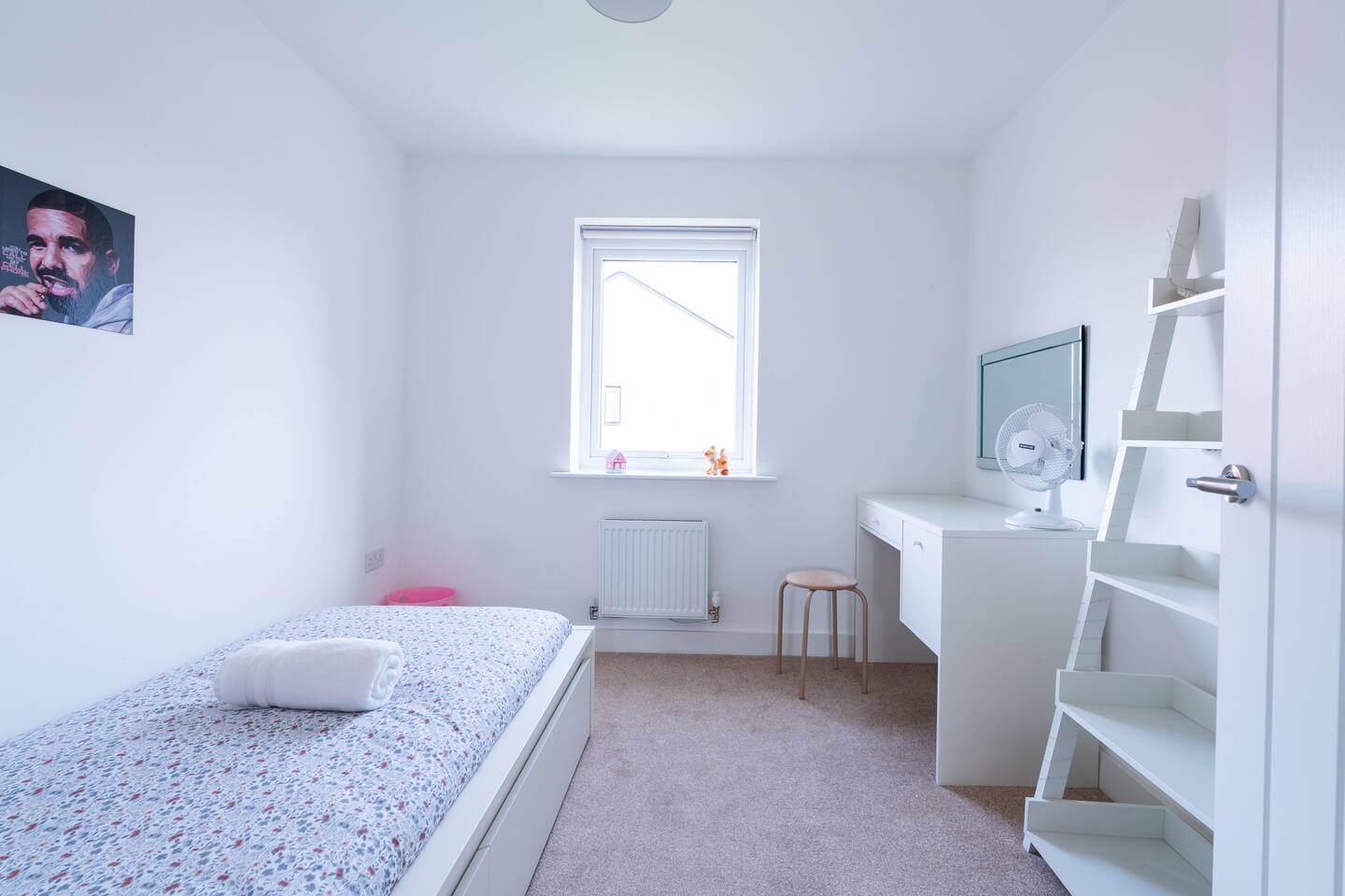 There is a good-sized driveway for 3 cars. Inside the house on the ground floor, you will find a fully equipped kitchen with a dishwasher, oven, fridge freezer, cooking pots, dishes etc, on this floor there is also a living room and access to the garden, and a convenient WC. The first floor consists of 3 bedrooms and a bathroom with a shower and bathtub. The beds are arranged as follows: a) Bedroom: 1 single bed b) Bedroom: 1 single bed that can be pulled to make a double bed c) Bedroom: 1 bunk bed When you land on the second floor, you will find a massive bedroom with a super king bed, a private bathroom, and plenty of space, light, and a view of the city center. Chest of drawers and/or wardrobes can be found in all bedrooms.