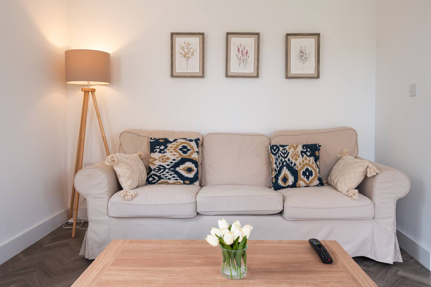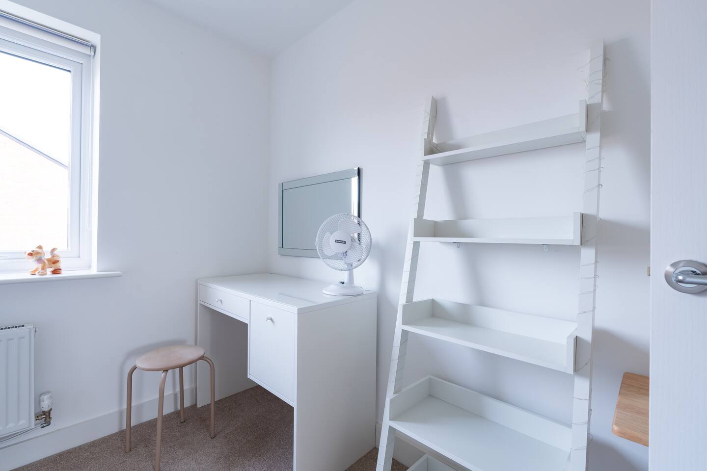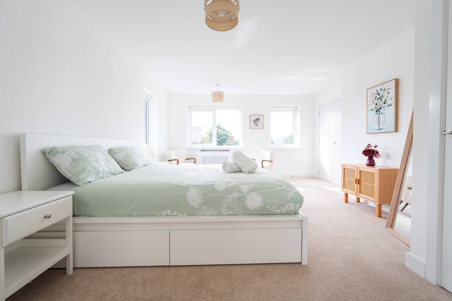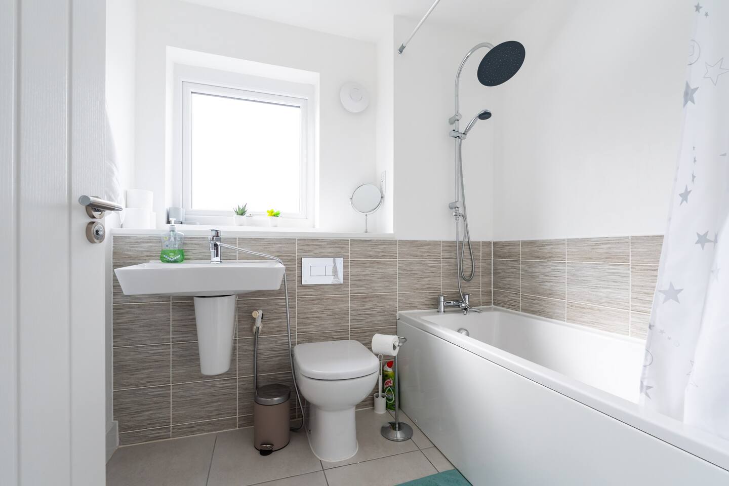 There is a good-sized driveway for 3 cars. Inside the house on the ground floor, you will find a fully equipped kitchen with a dishwasher, oven, fridge freezer, cooking pots, dishes etc, on this floor there is also a living room and access to the garden, and a convenient WC. The first floor consists of 3 bedrooms and a bathroom with a shower and bathtub. The beds are arranged as follows: a) Bedroom: 1 single bed b) Bedroom: 1 single bed that can be pulled to make a double bed c) Bedroom: 1 bunk bed When you land on the second floor, you will find a massive bedroom with a super king bed, a private bathroom, and plenty of space, light, and a view of the city center. Chest of drawers and/or wardrobes can be found in all bedrooms.