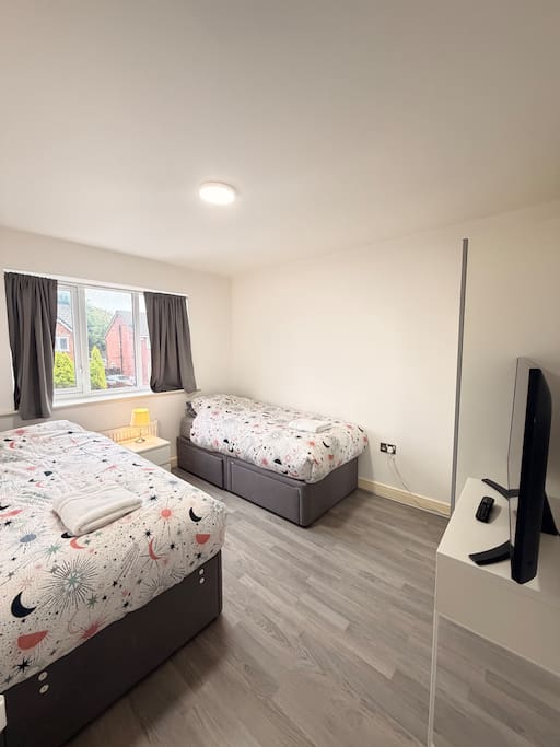 Only guests will have access to the house and its facilities, with no shared areas. The house has four bedrooms, but guests can only use three, as one bedroom is locked and unavailable. The living areas, kitchen, garden, and driveway for two cars are fully accessible for your stay.