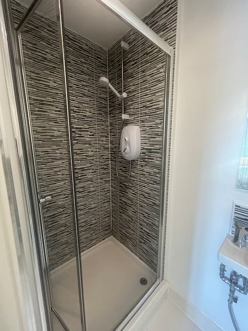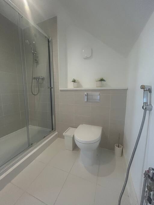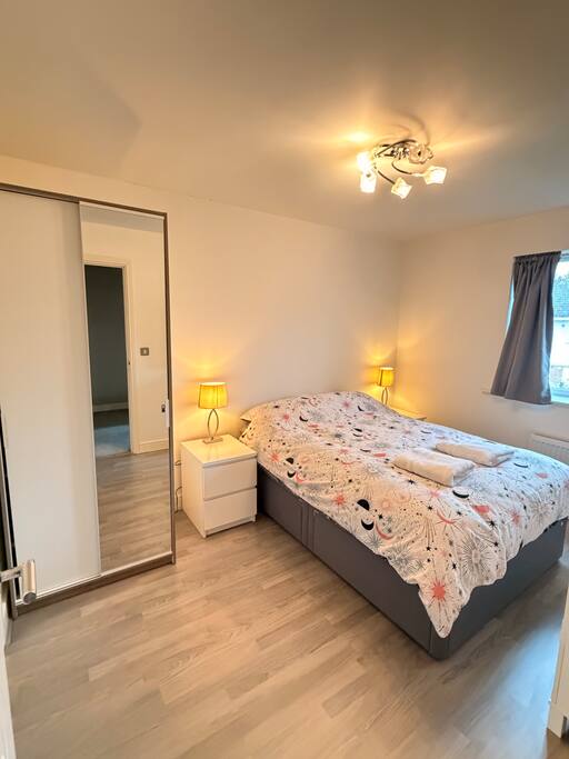 This is a 3-storey house. The top floor features a private large en-suite bedroom with a king-size bed. The middle floor includes another en-suite bedroom with a double bed, a second bedroom with two single beds, all with wardrobes, and an additional bathroom with a bathtub and shower. The ground floor offers a kitchen and dining area, and a living room with garden access. The front driveway fits two cars. Perfect for families or groups.